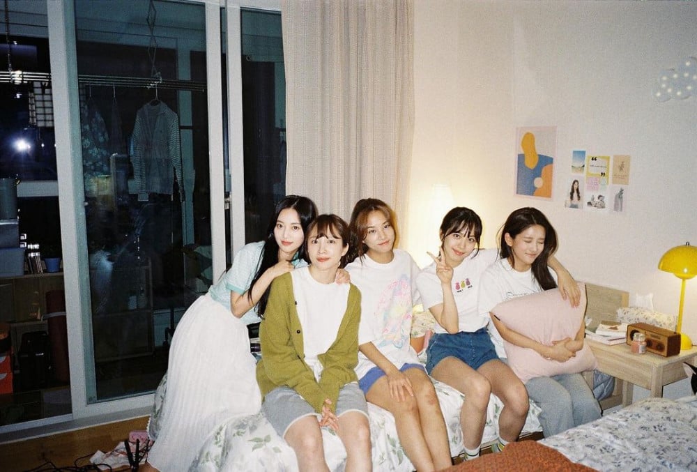Cotton Candy, the main girl group in the drama, pose together in a friendly atmosphere. This 5-member group features characters played by Hani (the leader), LABOUM's Solbin, actress Han So Eun, Cosmic Girls' Exy, and Red Square's Green.