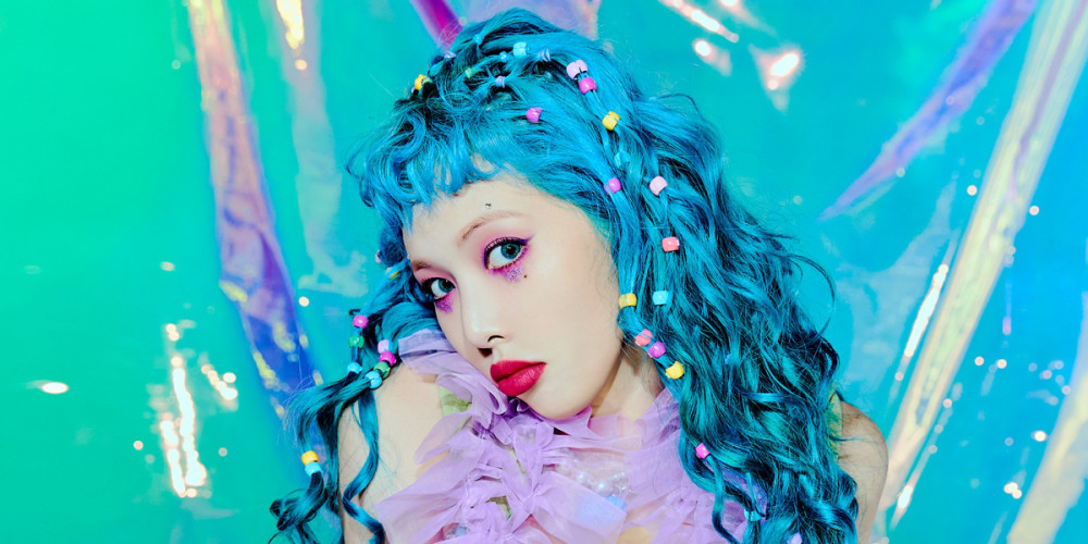 The latest set of teaser photos for HyunA and Dawn's upcoming album '1+1=1' feature HyunA's individual concept cuts, where the idol rocks neon blue hair, vivid colored makeup and outfits, all topped off with her signature, crazy and beautiful vibe!