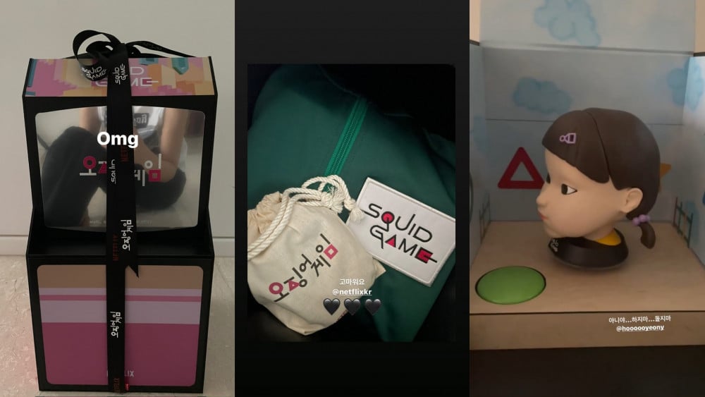 According to the photos that have been revealed, the gift box includes the tracksuit that the contestants wore in the game along with the figure of the doll from 'Green Light, Red light.'