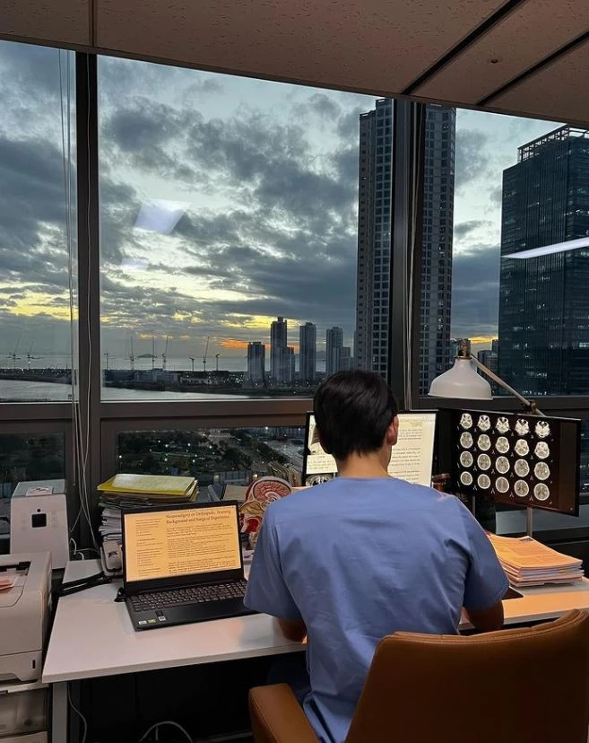 Rain was seen sitting in front of a desk with MRI scans and various medical books as he was concentrating on his studies. Rain uploaded these photos with the caption "Studying hard."