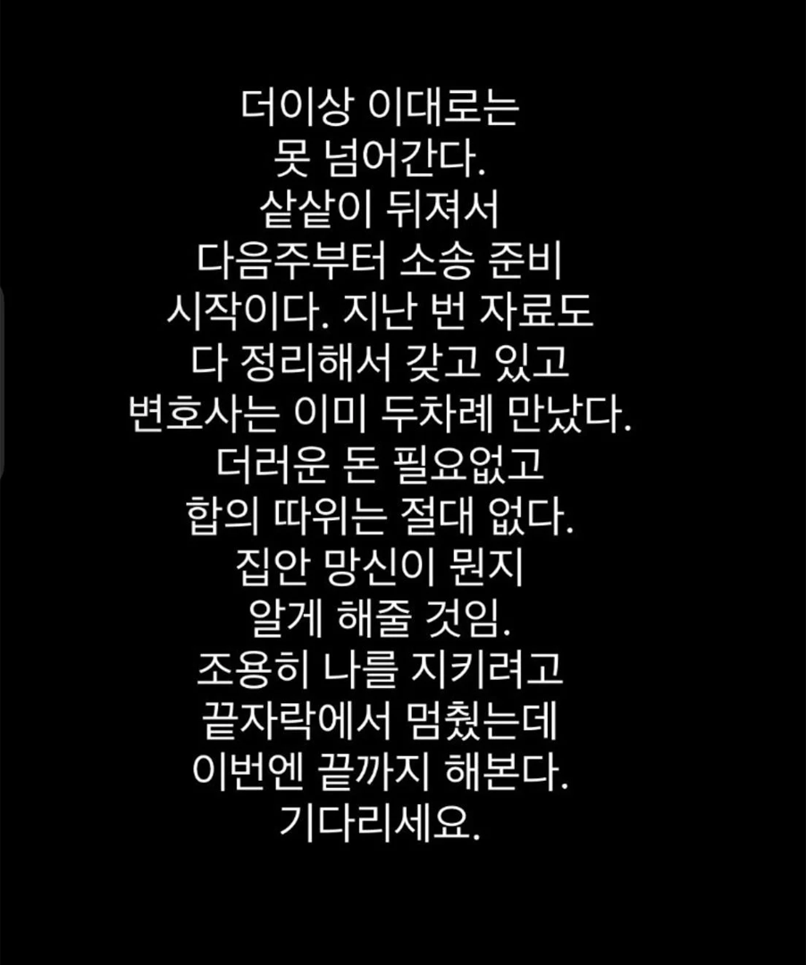 According to that online community post, the editor wrote, "I won't be able to let this go any further. I'm going to look everywhere and I started preparing to take legal action next week. I have everything organized and I already met with the lawyer twice. I don't need dirty money and there is no such thing as settlement. I will show what it means to bring shame to the family. I stopped right before the end to quietly protect myself but I will not go until the end. wait for it."
