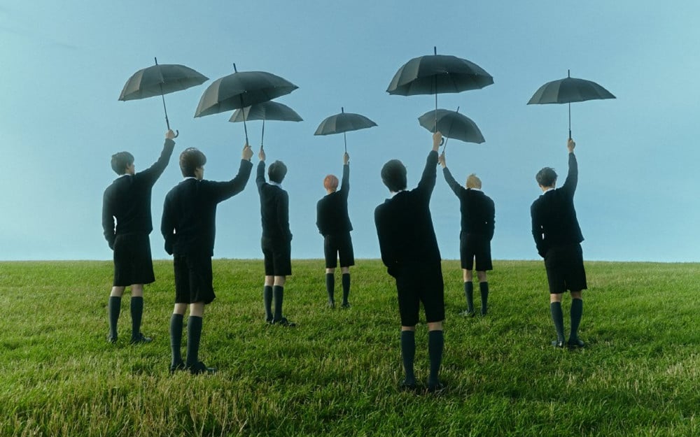 The photo showed the members wearing black and black against a backdrop of the open green field and blue skies. The collection of photos has an overall oneiric ambiance with calming aesthetics.
