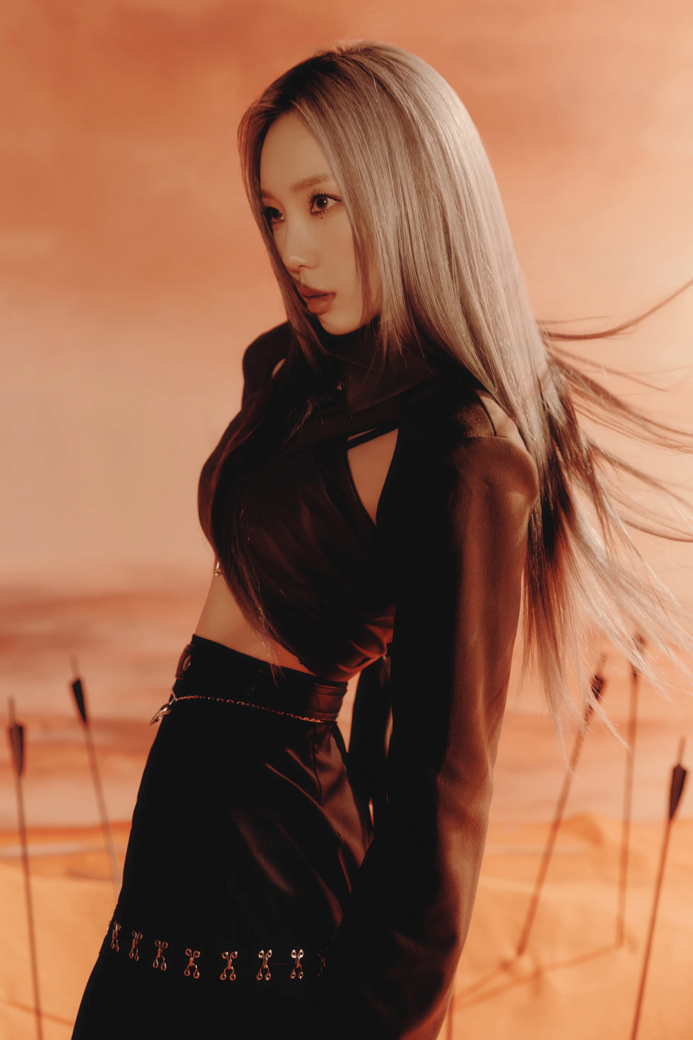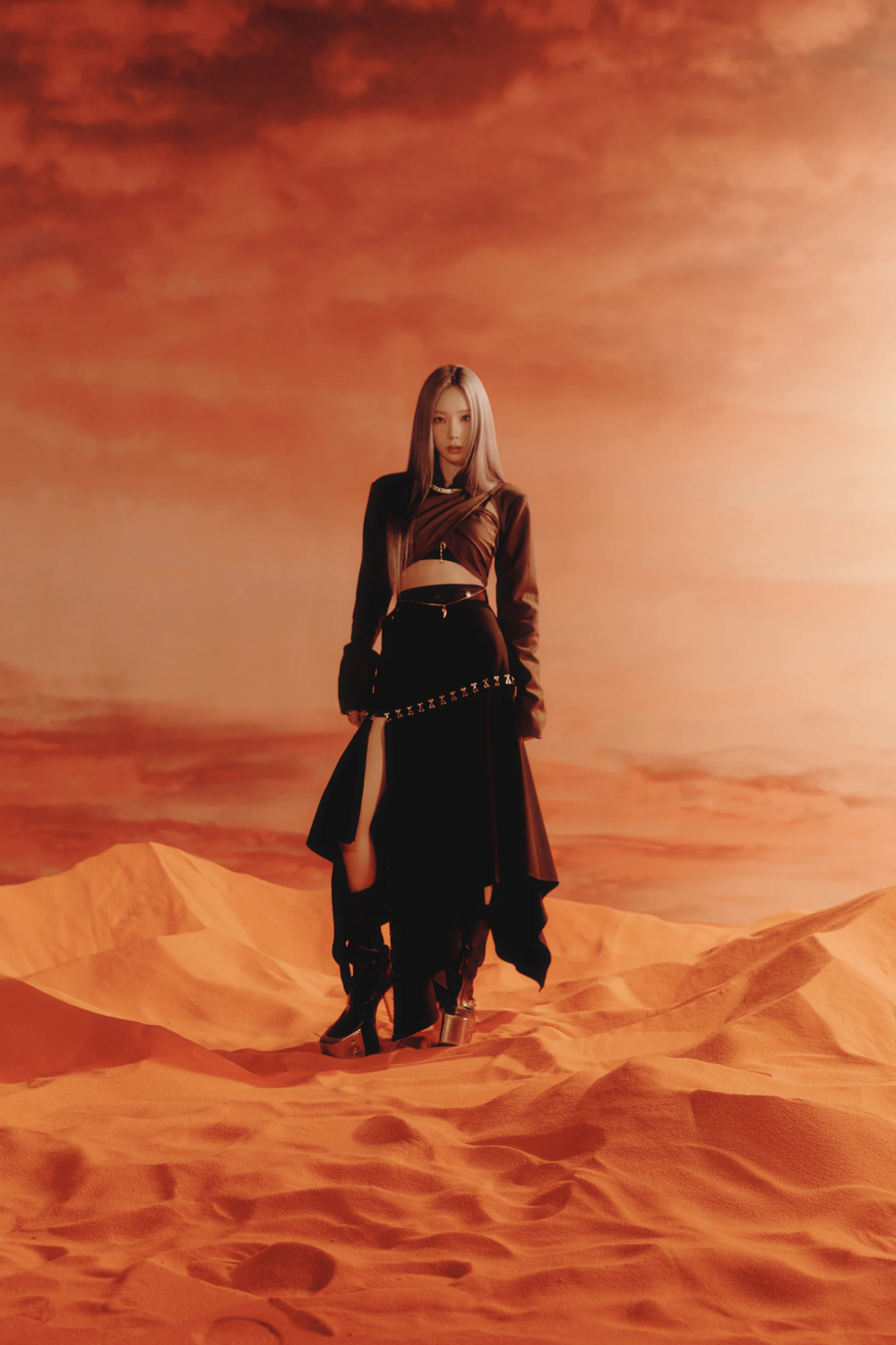 On February 8 KST, Taeyeon dropped more teaser photos in which she became a powerful desert queen. In the photos, she is seen in the middle of a desert filled with reddish-orange sand, wearing a dark brown outfit making her stand out against the backdrop.