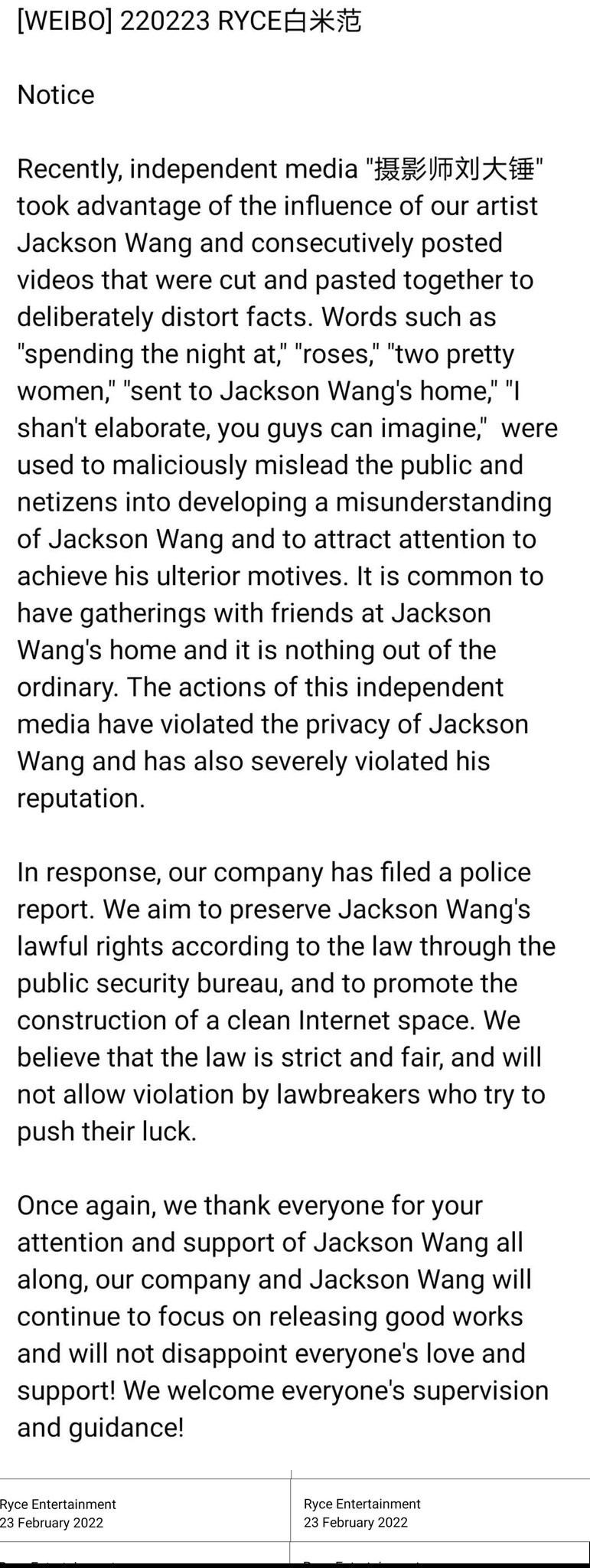 Then on February 23, Jackson's agency in China released a statement explaining they will take legal actions against those who spread false information and released a video distorting the facts. The agency stated they will take legal action to protect the artist's privacy and rights while filing a police report against the independent media who released the edited video.