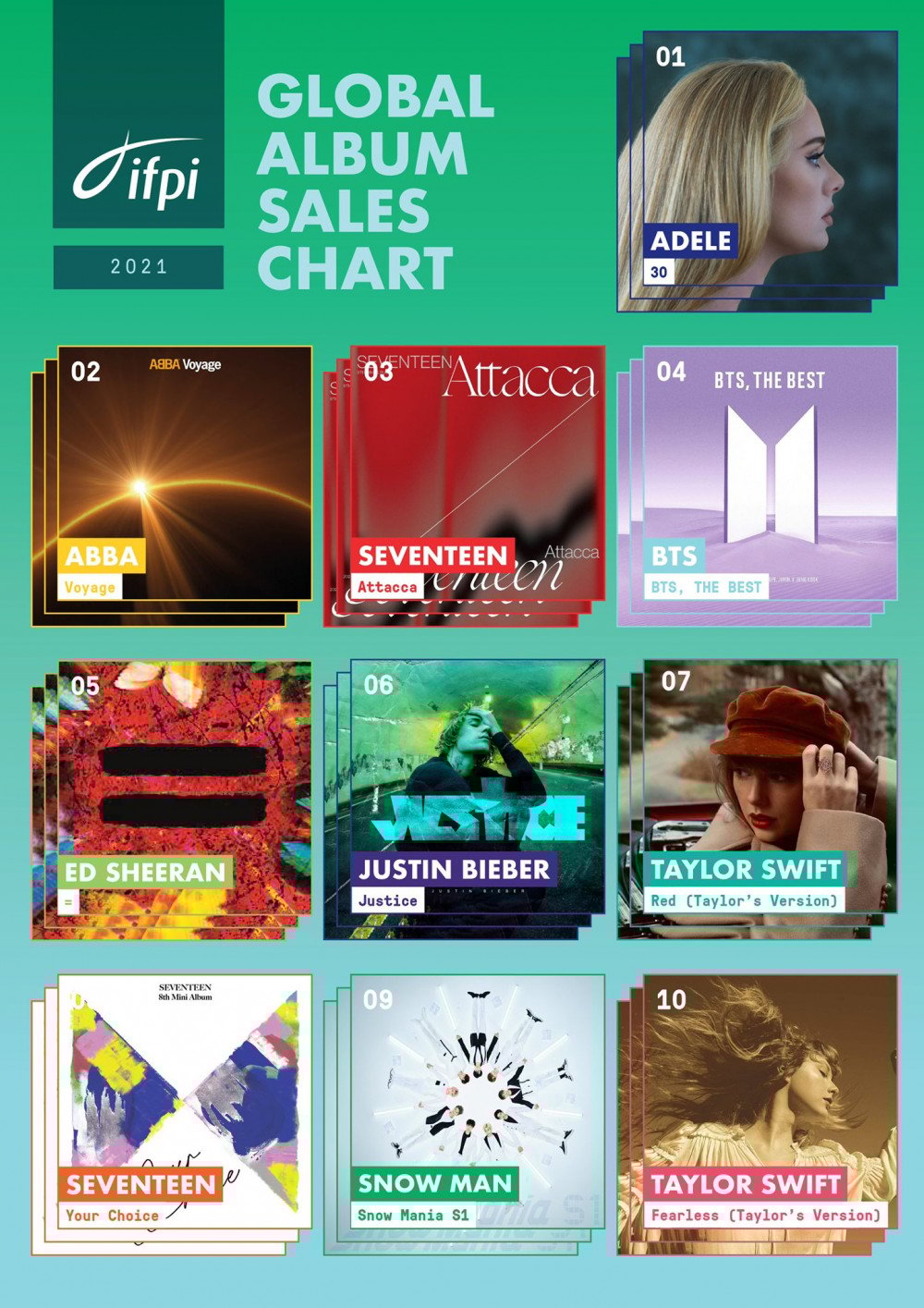 The International Federation of the Phonographic Industry (IFPI) has revealed 2021's 'Global Album Sales Chart', listing out the top 10 biggest-selling albums worldwide in the past year.