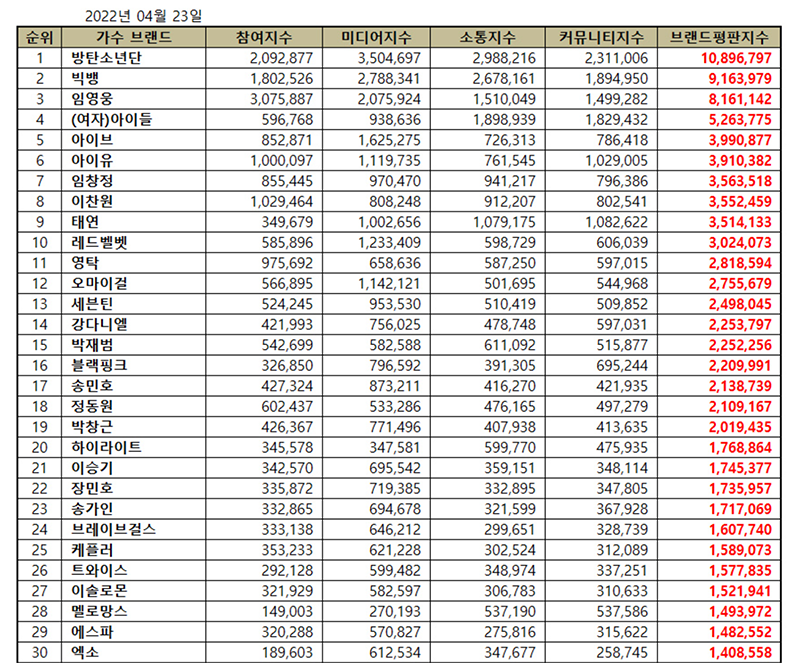 From March 23 through April 23, 2022, the Institute analyzed big data of currently promoting singers in areas including consumer participation, media activity, communication, community activity, etc.