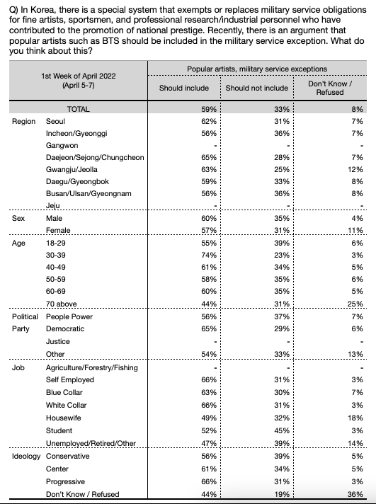 Participants were asked if popular artists such as BTS should be included in the system that exempts or replaces military service obligations for citizens who have contributed to the promotion of national prestige. According to the results, 59% voted in favor of exceptions while 33% voted against, with 8% abstaining from a vote. It was also found that the opinion on popular artists being included in military service exemption does not differ depending on the supported political party or political ideology.
