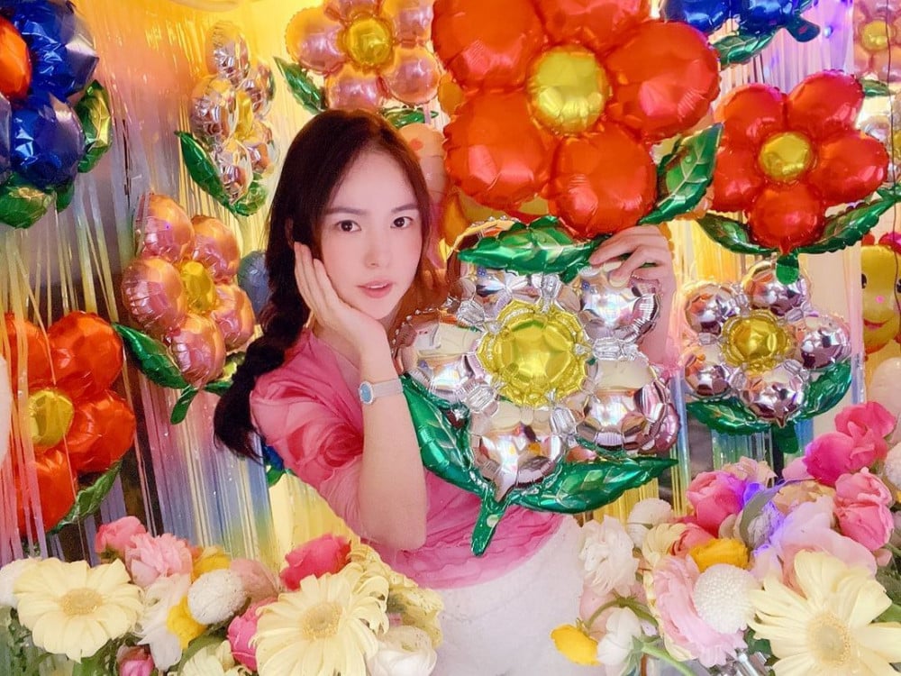 On April 22, Min Hyo Rin posted a series of photos showing a room filled with flower-shaped balloons. In one photo, Min Hyo Rin is looking directly at the camera while holding a balloon.