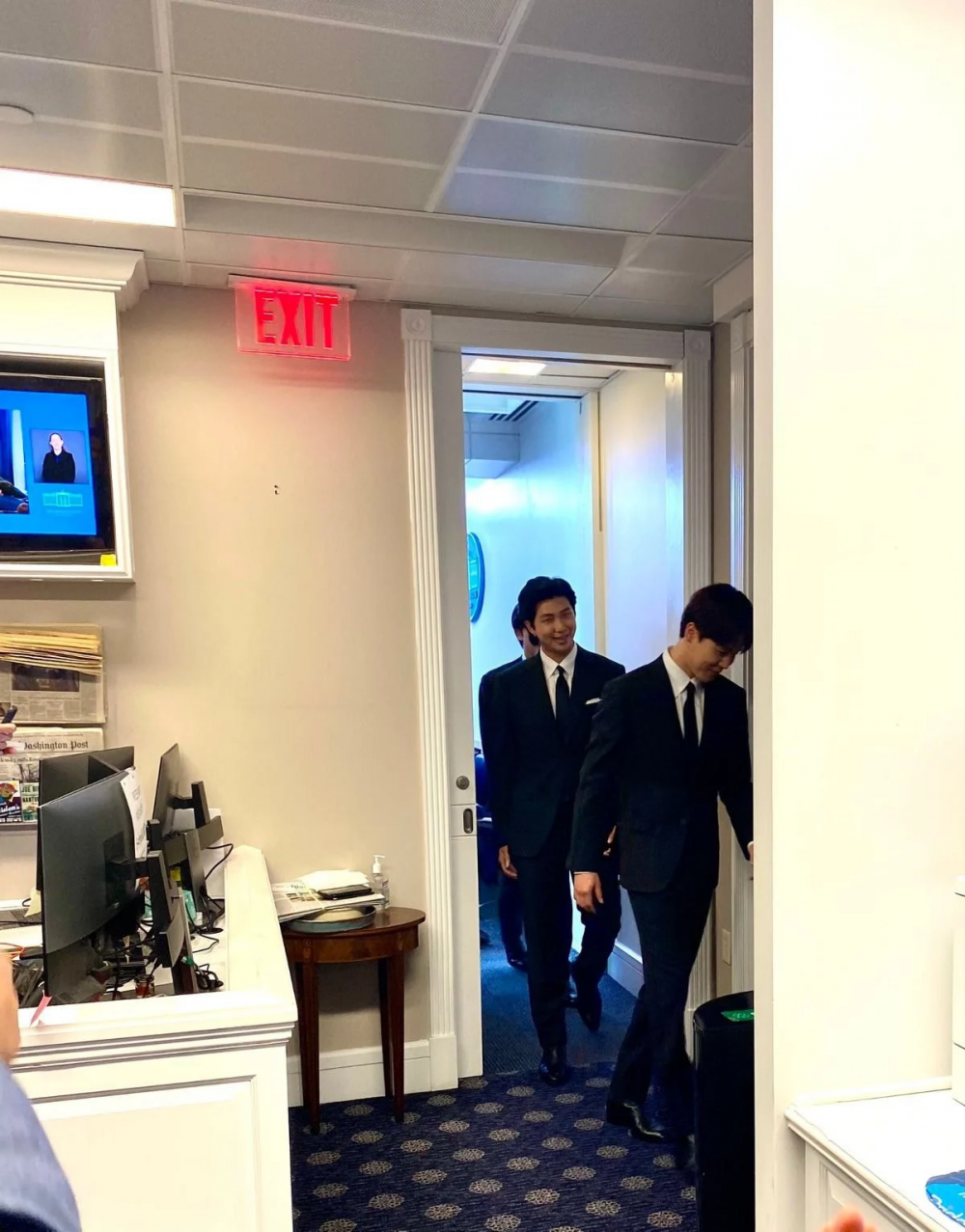 Korean netizens commented, "I'm so proud of them," "they're so awesome," "They look so cool all wearing black suits," "they all have their hair dyed black, I love it," "They all look so handsome," "There were so many people gathered in front of the white house to see BTS," "They are all so good looking and awesome," "I can't believe we get to see BTS at the White House press briefing," "This is so awesome, it's so cool to see them at the White House like that," and "I'm so proud to be Korean with BTS."