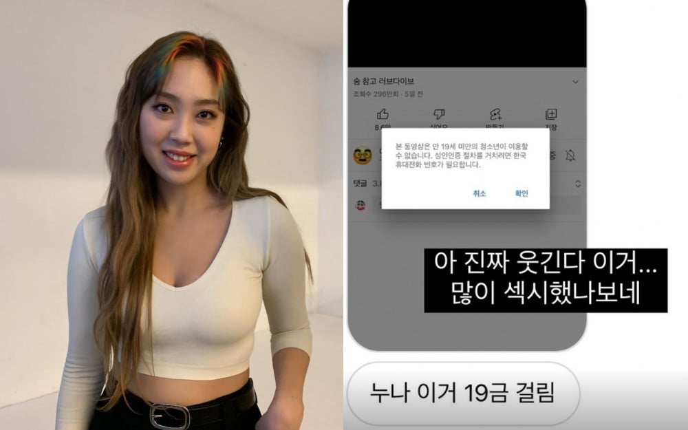 On June 16, the rapper shared on her Instagram story, "Oh this is funny...It must have been too sexy" along with a capture of a direct message from one of her fans. The fan wrote to Lee Young Ji saying, "Noona, this was restricted to people under 19." The fan also sent a capture of Lee Young Ji's YouTube video titled "Love Dive while holding our breath."