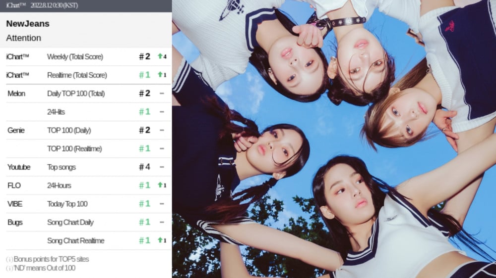 Among the debut songs of K-Pop idols released in the last 5 years, NewJeans' "Attention" is the only song to ever simultaneously hit #1 on all four real-time charts. BLACKPINK was the last group to rank #1 on these real-time charts with their debut song in 2016.