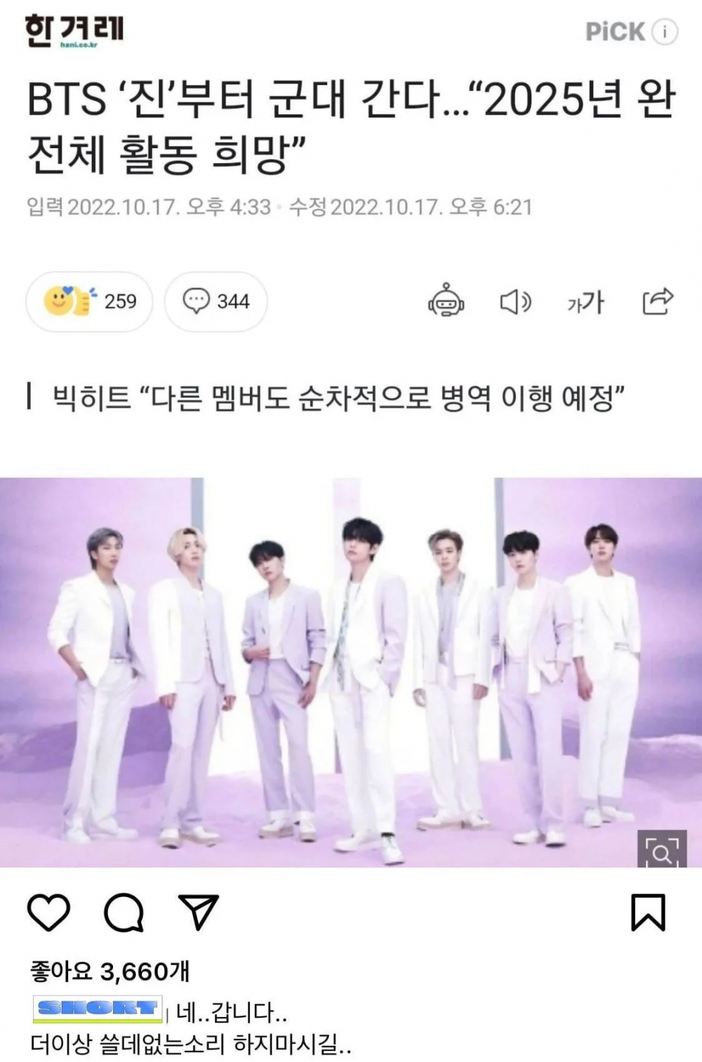 After the announcement was made, K-netizens responded, saying they were relieved that the global boy group will no longer be embroiled in controversies over the military issue.