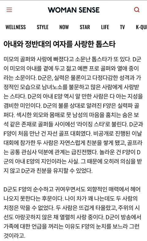 Earlier this week, a rumor about a "top star" who was cheating on his wife was published by 'Woman Sense' magazine. According to the rumor, this "top star" is known as the star of all stars for being top-tier in singing, dancing, acting, and more. The rumor claimed that the "top star", who is married to a woman of renowned beauty and intelligence, was currently cheating on his wife with a pro-golfer, 'A'. Furthermore, the rumor alleged that the "top star" even had a separate apartment with 'A', and that the he had been found out by his wife once and warned.
