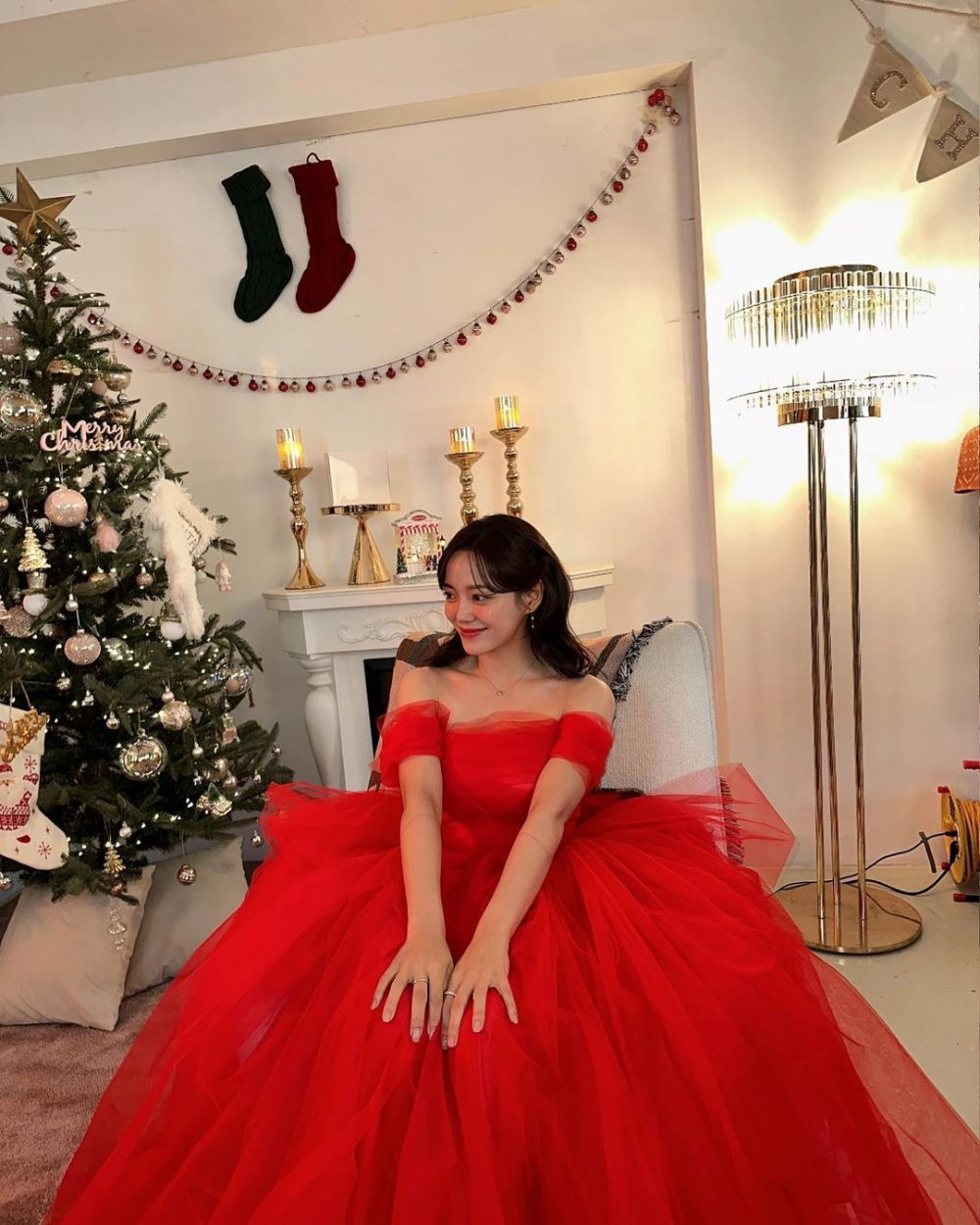 On December 7, Kim Se Jung posted a few photos without any caption except Christmas emoticons. In the pictures, the actress is wearing a bright red ballroom dress against Christmas decorations that radiates holiday vibes.