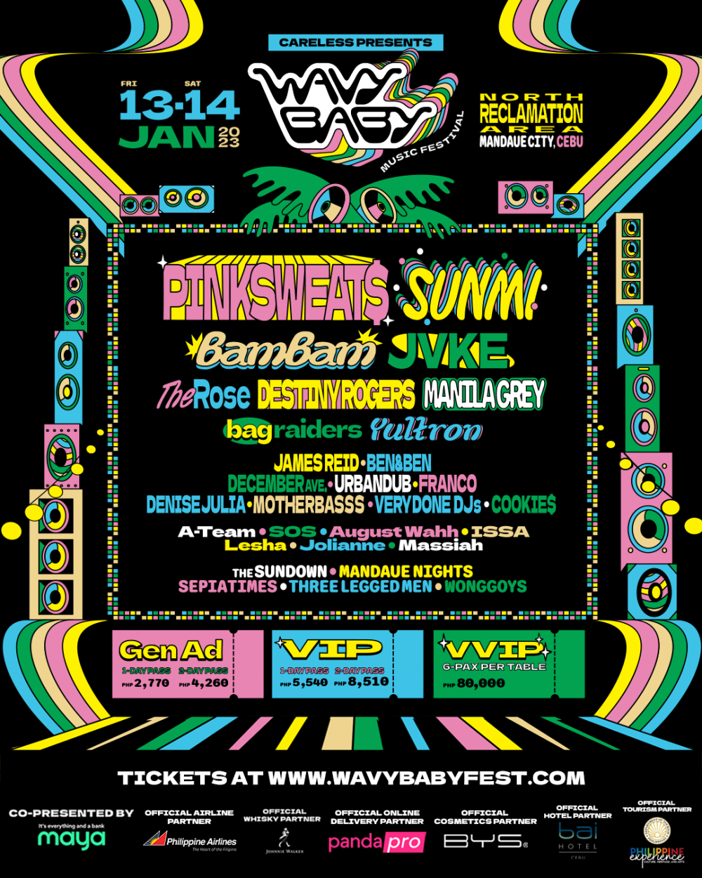 Wavy Baby Festival is Careless Music's first-ever music festival, and it is bound to make the return of Sinulog one for the books. It's a two-day festival happening on January 13-14, 2023 at the North Reclamation Area in Mandaue City, Cebu, Philippines with a star-studded lineup of over 20 artists recognized locally and internationally.