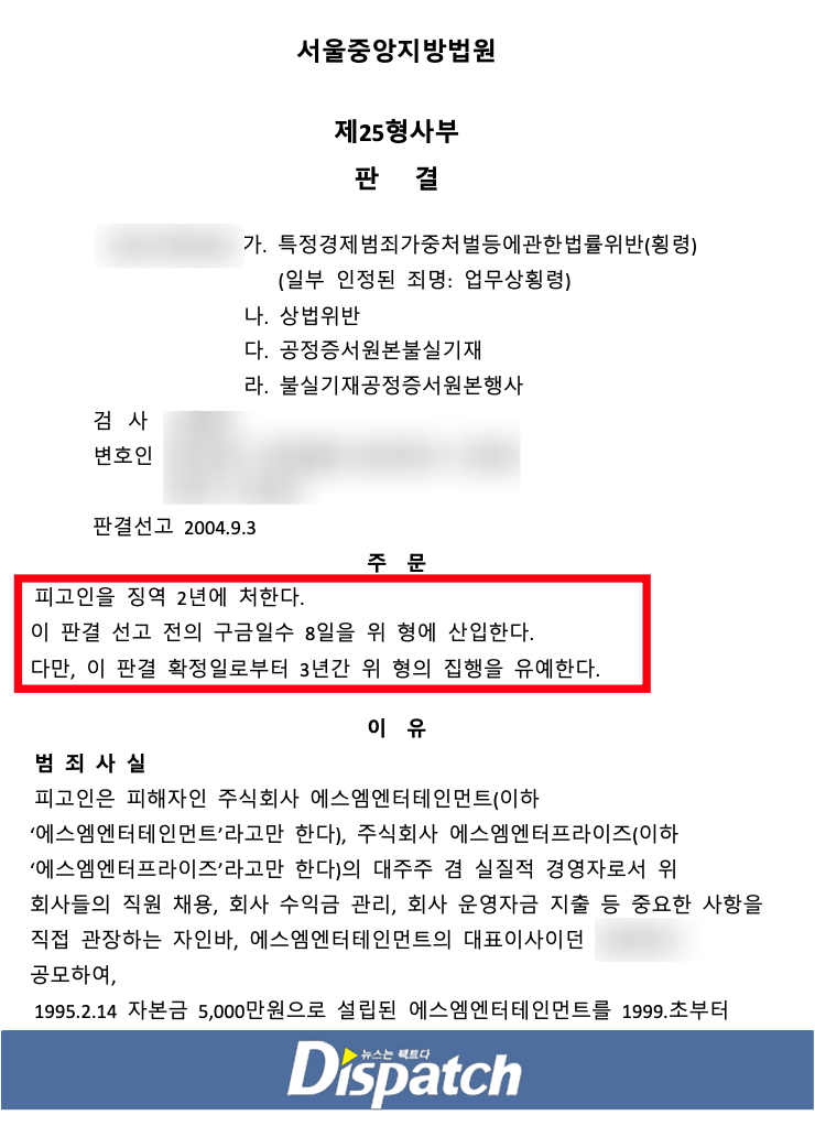 However, in an interview with 'Dispatch' on February 17 KST, a former director of SM Entertainment confirmed, "He used fake capital to pay for stocks so the company could go public. There was no agreement from the board of directors because there was no board meeting to discuss this matter. A record of the meeting's numbers were drawn up afterward as a matter of procedure by the legal team. Lee Soo Man was behind it all. He only returned the borrowed funds after the police investigation began."