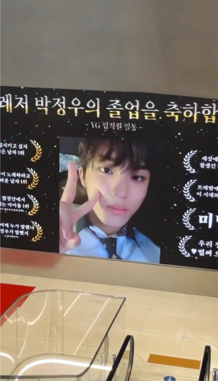 First, the company congratulated Jeongwoo's high school graduation by dedicating the large LED screen on the first floor of YG Entertainment entirely to Jeongwoo. (Usually, this LED screen would have YG Entertainment artists' MVs or promotional content playing.)