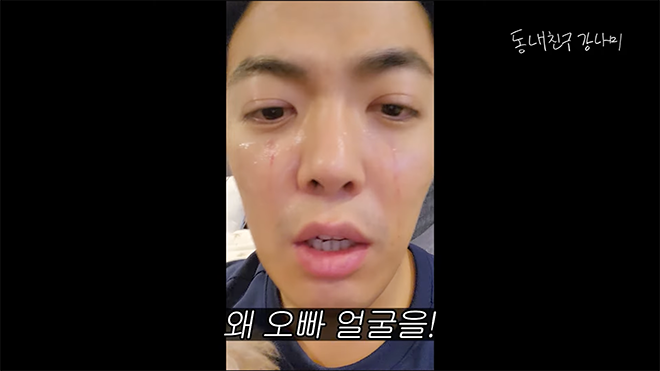 He then continued, "I was playing with a certain someone, but then they got angry and did this to my face." Kangnam then pulled off his mask to reveal two long scratches on his cheeks, creating marks resembling red tear streaks.