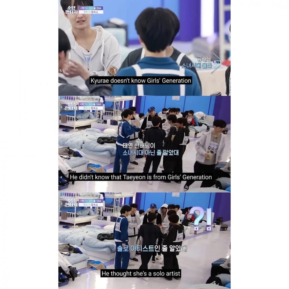 A scene of a trainee telling the others, "Gyu Rae doesn't know Girls' Generation. He didn't know that Taeyeon is from Girls' Generation. He thought she's a solo artist," quickly made its rounds on the internet, with one online community suggesting that the confusion might be due to Kim Gyu Rae being born in 2009, roughly two years after the girl group debuted.