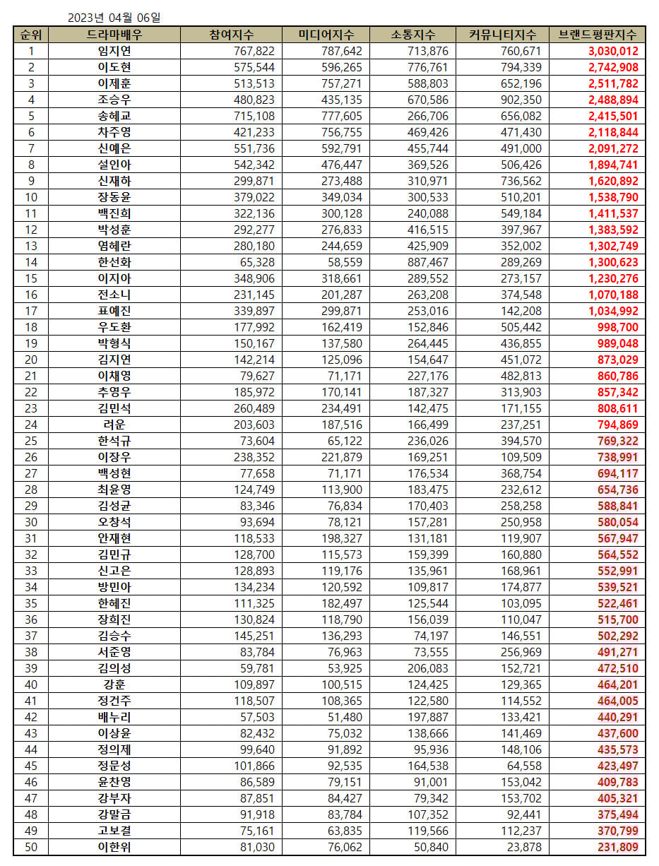 From March 6 through April 6, the Korea Brand Reputation Research Institute analyzed big data of 50 drama actors/actresses who appeared in a TV series (including streaming platform series) in the past month, including in the following areas: consumer participation, media activity, communication, community activity, etc.