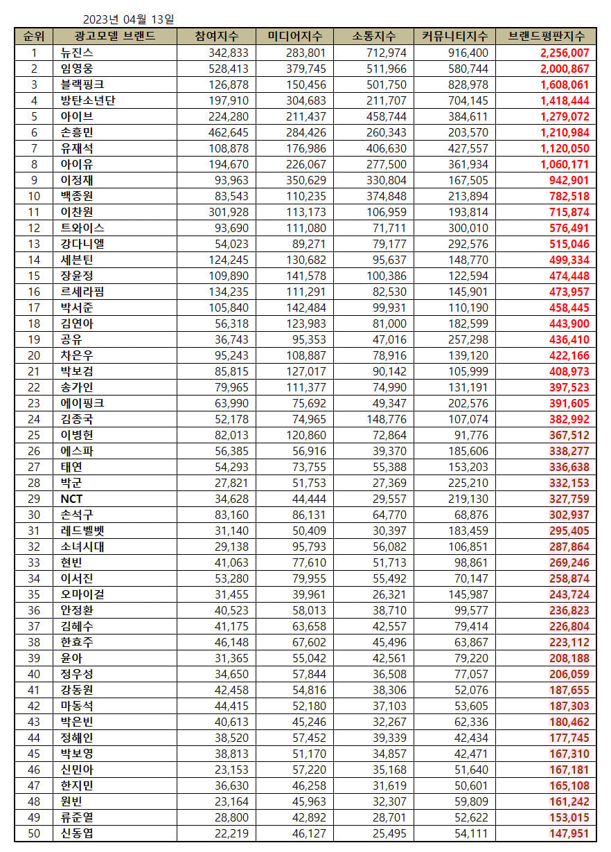 Meanwhile, the top 30 celebrity CF models in terms of brand value ranking are, in order: NewJeans, Lim Young Woong, BLACKPINK, BTS, IVE, Son Heung Min, Yoo Jae Suk, IU, Lee Jung Jae, Lee Chan Won, TWICE, Kang Daniel, Seventeen, Jang Yoon Jung, LE SSREAFIM, Park Seo Joon, Kim Yuna, Gong Yoo, Cha Eun Woo, Park Bo Gum, Song Ga In, Apink, Kim Jong Kook, Lee Byung Hun, aespa, Taeyeon, Park Goon, NCT, and Son Suk Goo.