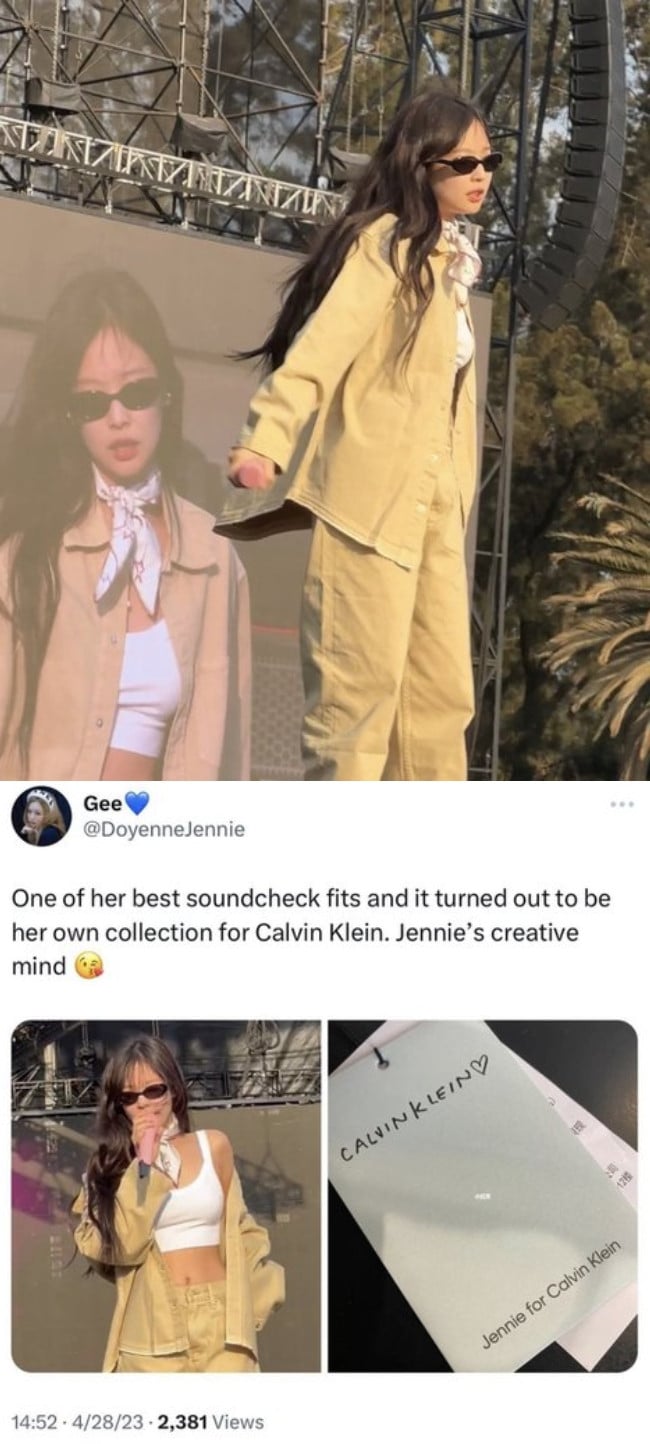 On April 30 KST, BLACKPINK's Jennie took to her personal Instagram to reveal various photos from her recent stage rehearsal for the group's concert tour. Posing in a cream yellow shirt jacket and matching pants, completed with a pair of chic sunglasses, Jennie garnered a lot of attention with her caption, "Special things coming with @calvinklein 🦋."
