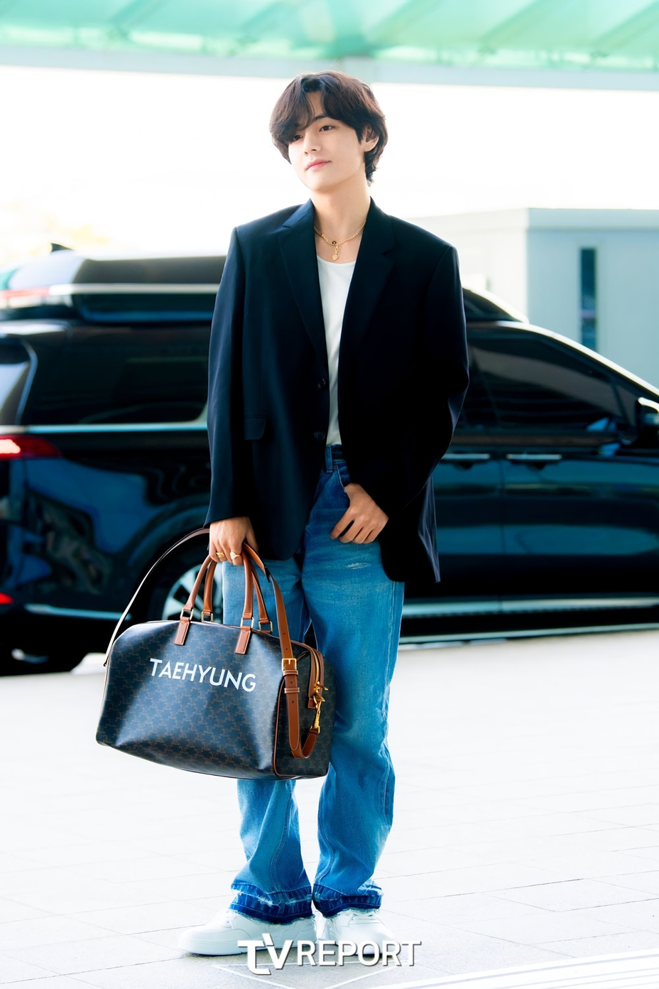 Kim Taehyung, aka V of BTS, showed off his stunning visuals and eye-catching bag at the airport.