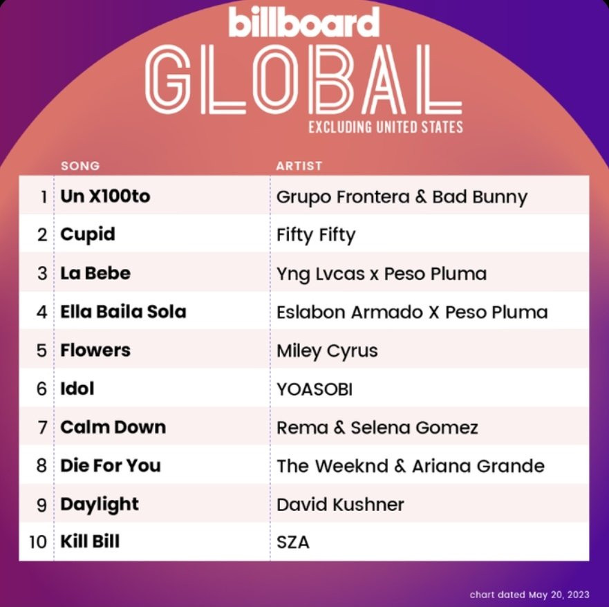 In addition, "Cupid" spent its 5th week charting in the Top 3 of Billboard's 'Global Excl. U.S' chart, rising from No. 6 to a new peak of No. 2.