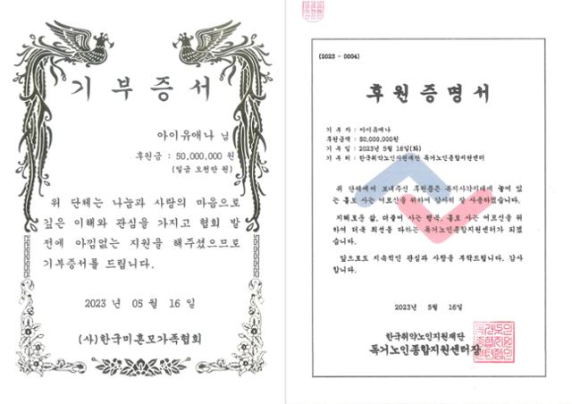 Families Association (KUMFA), and the Korean Foundation for Support of the Senior Citizen in Need. In total, she donated to four separate foundations under 'IUaena', representing her name (IU) and her fandom name (Uaena).