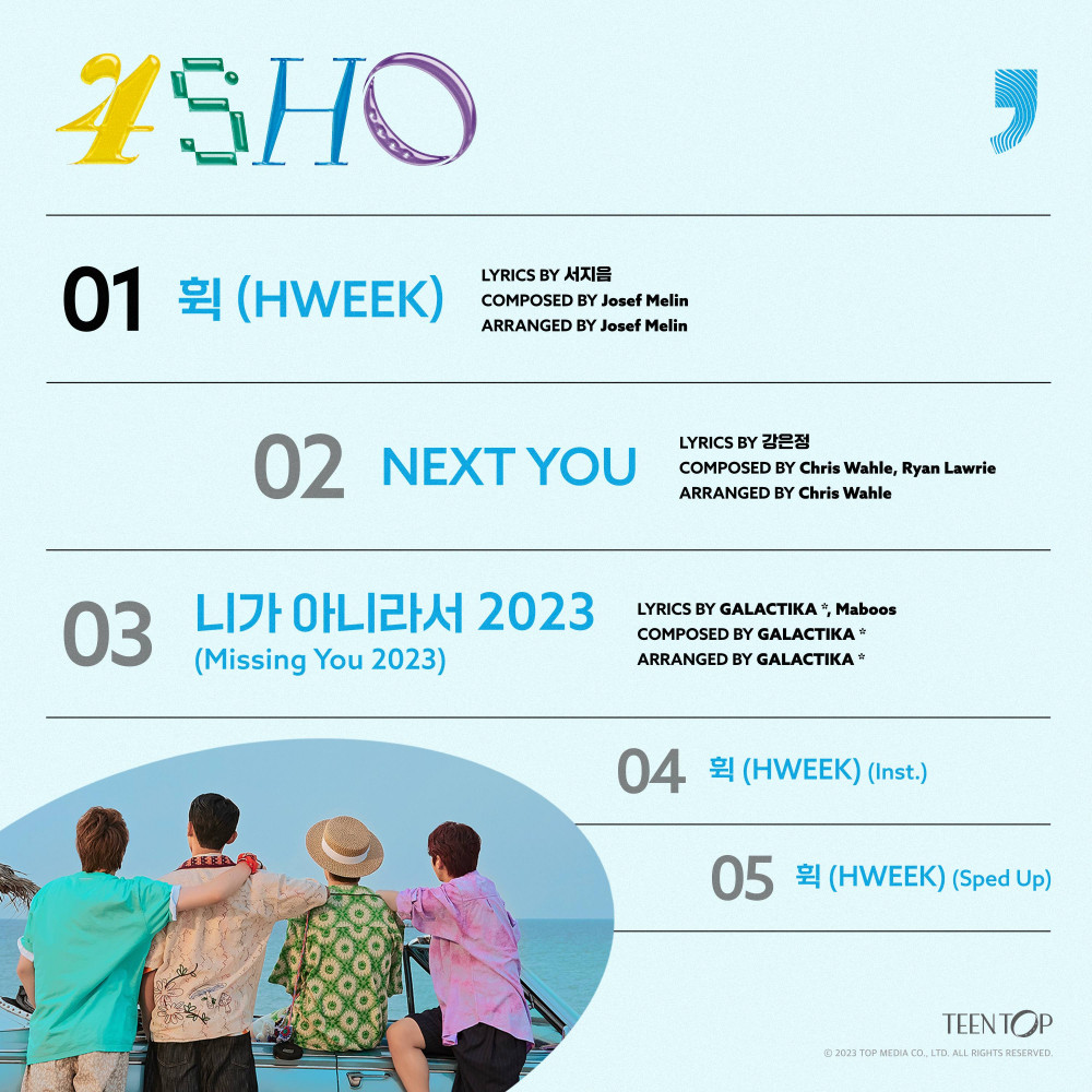 TEEN TOP have revealed a track list for their anticipated comeback album '4SHO', and fans are excited to hear what they have in store. The album features five tracks, including the title song "HWEEK".