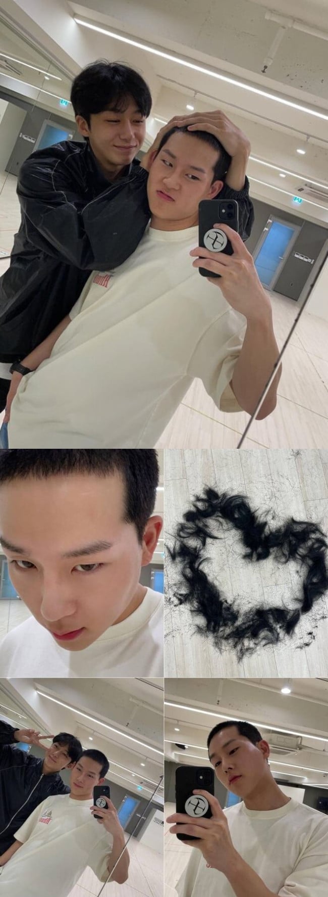 On July 23rd, Jooheon took to his personal Instagram account to share a series of photos documenting the process of his haircut for his upcoming military enlistment. In one photo, Jooheon showed his hair scattered all over the floor, forming the shape of a heart. He also shared funny photos with his fellow group member, Hyungwon, who was seen playfully hugging Jooheon's freshly shaved head.
