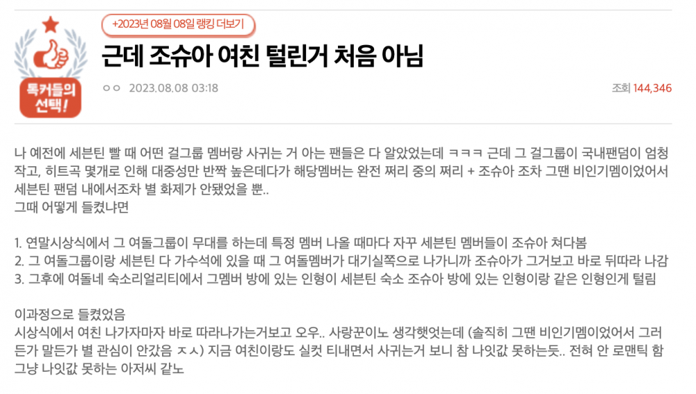 The Korean online communities became noisier when rumors surfaced that Joshua was previously dating a female idol, and that idol was Momoland's Jane.