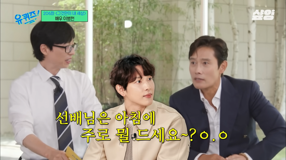 Lee Byung Hyun then confessed that the situation was rather awkward because he didn't know Siwan personally at the time. He continued, "He (Siwan) has an odd energy that flows from him. He doesn't blink and stares at you and he asked me 'What do you usually eat for breakfast?' so I replied, 'What you normally eat too!'" making everyone laugh. Lee Byung Hun added, "He asks questions that are unexpected."