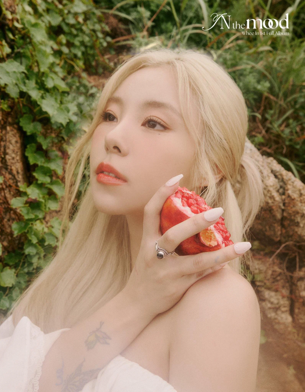 In these new photos, the idol evokes the mood of a Grecian goddess, sporting blonde hair and a gorgeous white dress as she holds a red pomegranate or poses while caressing some hanging grapes. The concept is for her upcoming 1st full-length solo album titled 'IN the mood' and is said to be the second part to her previously released mini album 'WHEE.'