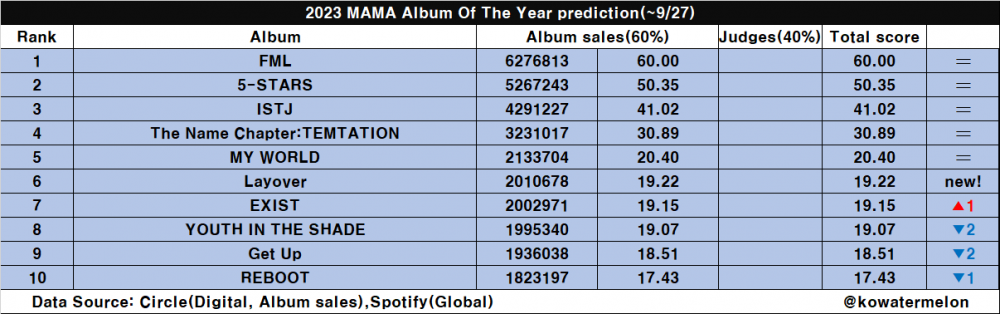 First, here are the netizens' predictions for the '2023 MAMA Awards', taking into account digital, album sale, and global (Spotify) streaming scores.