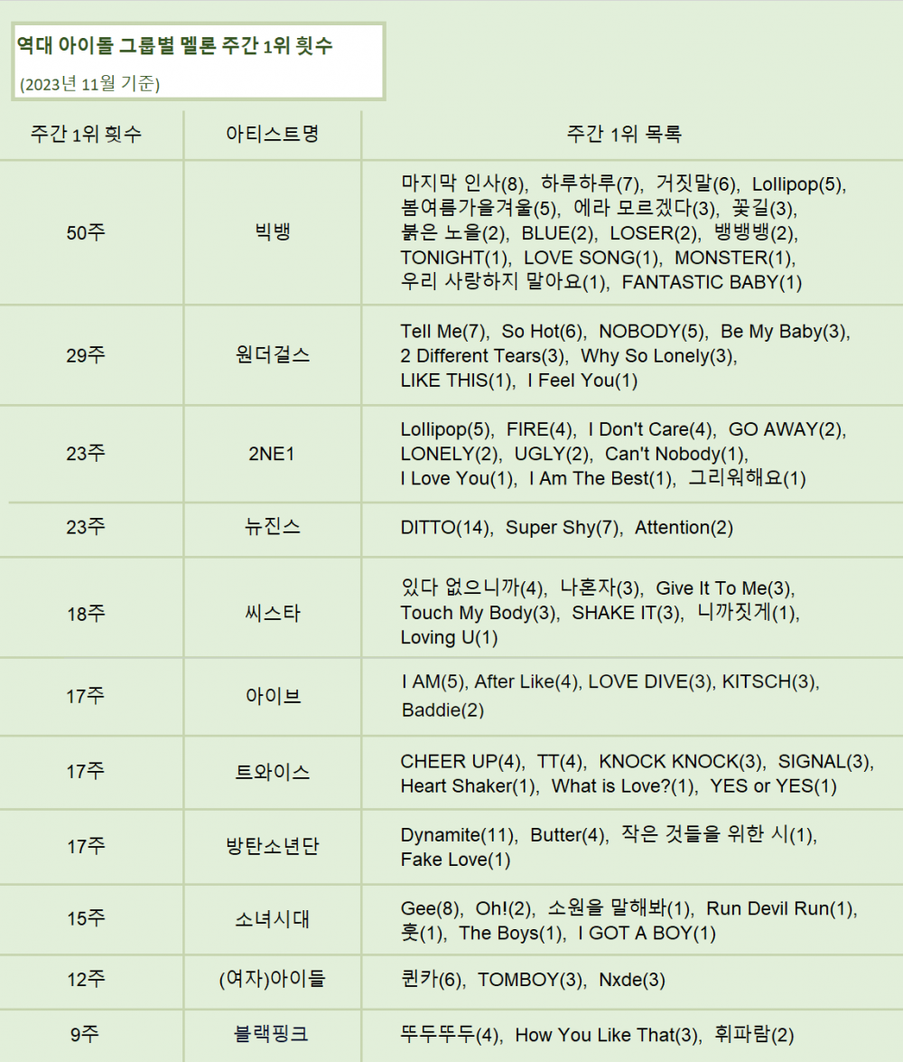 A netizen has compiled a list of songs that have attained the No. 1 position on the weekly chart. Leading the chart, Big Bang has an impressive record of 50 weeks at number 1. They are closely followed by Wonder Girls, who hold the second spot with 29 weeks, and in the third position, 2NE1 and NewJeans are tied at 23 weeks each. Remarkably, NewJeans stands out as the only non-second-generation artist in the top three, achieving this feat just one year after their debut. The detailed chart can be viewed below.