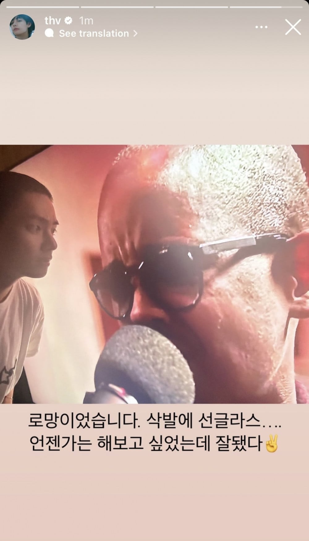 In the second photo, Taehyung is seen staring at a bald man wearing shades on a large monitor. He shares that he has always wanted to try the "shaved head with shades" look and seized the opportunity to fulfill this dream now.