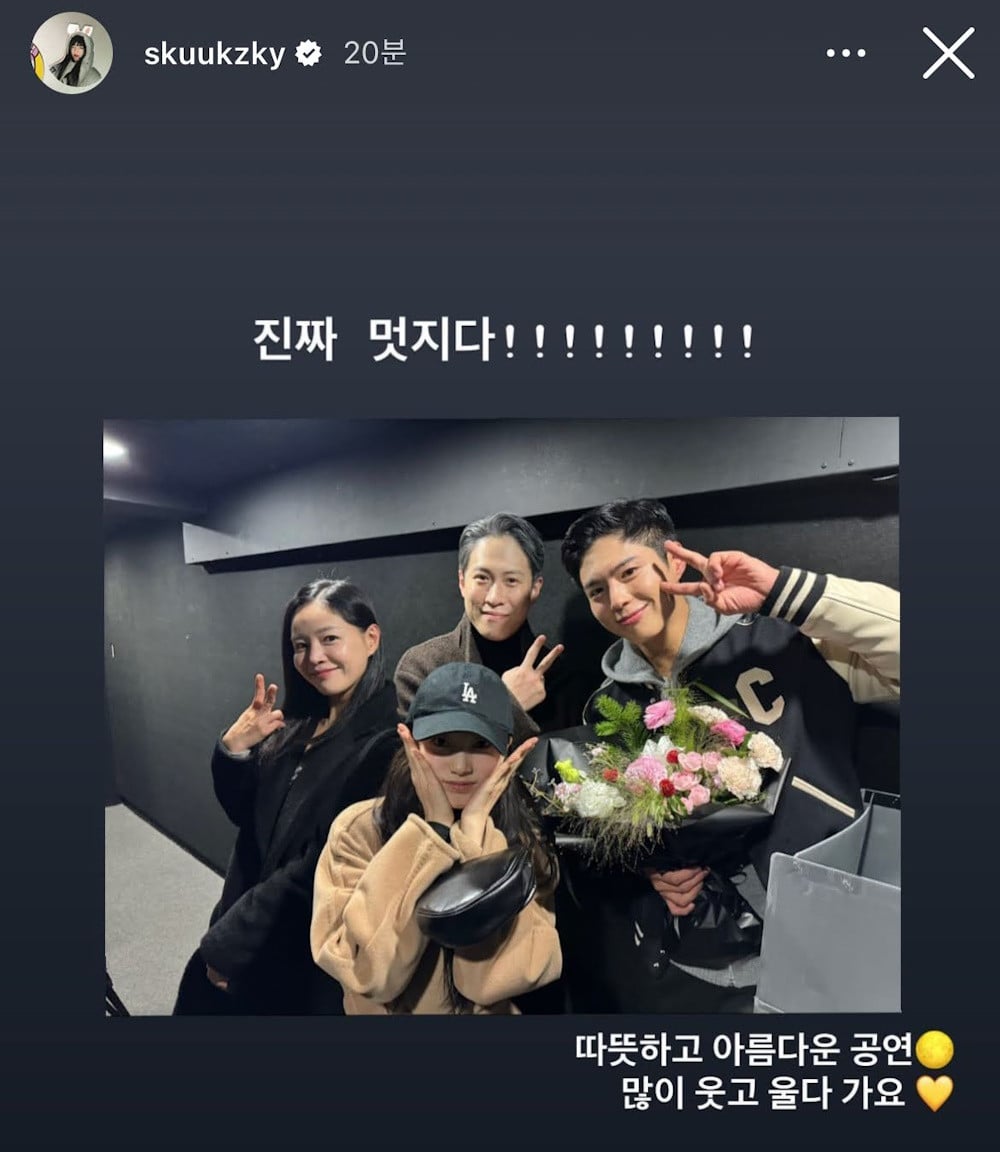 Suzy and her fellow 'Uncontrollably Fond' co-star Lee Young Ah went to see Park Bo Gum's 'Let Me Fly, sharing a photo of the group backstage on her Instagram story. The idol-turned-actress shared the images below along with the comments, "A warm and beautiful performance. I laughed and cried a lot."