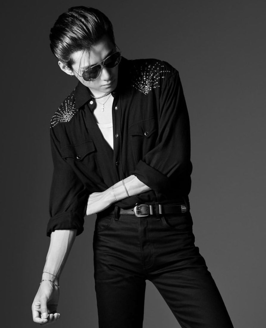 His piercing gaze, immaculate facial features, and alluring charisma perfectly complement the cool outfit he wears.