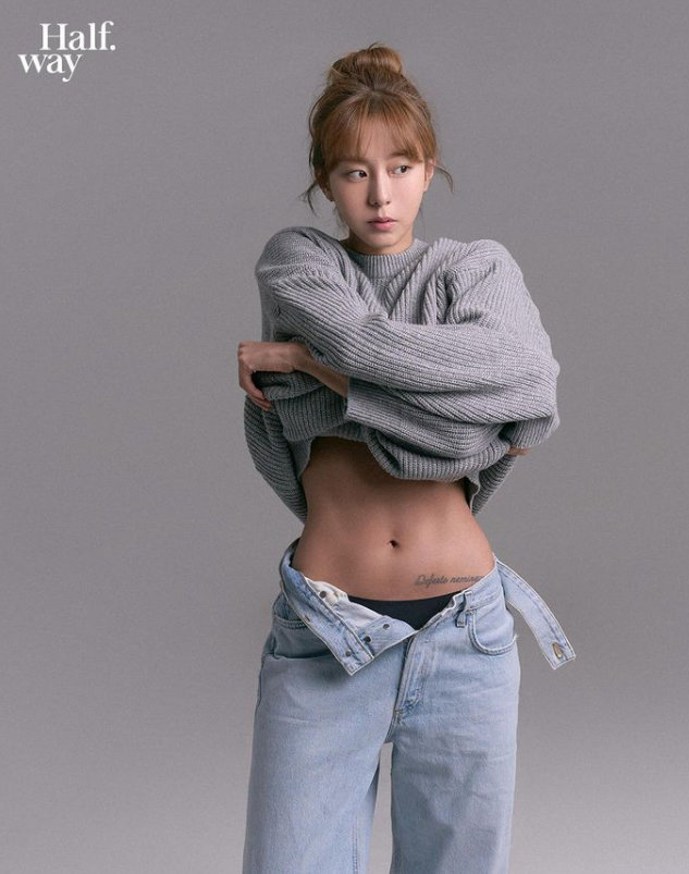 On February 16, UEE treated her fans to a series of body profile snapshots. Sporting a cropped-style gray knit top, she elegantly lowered the zipper of her jeans, revealing her sculpted waistline and impressive abs, drawing admiration.