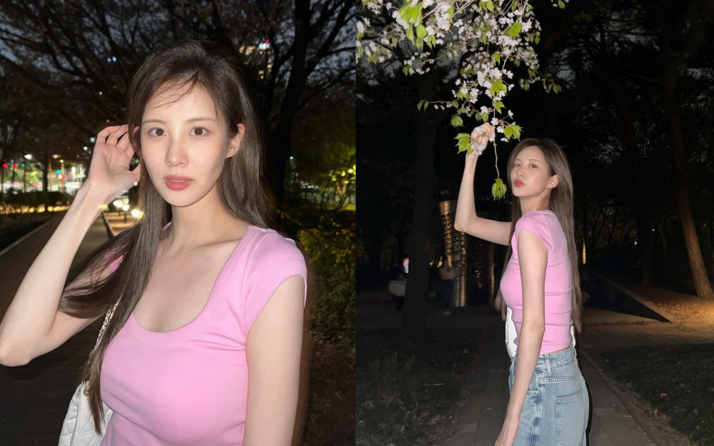 In the photos, Seohyun can be seen gracefully posing amidst a sea of cherry blossoms, exuding elegance and joy as she enjoys the season's warmth. She was also spotted enjoying a nice walk at night, matching simple faded jeans with a pink T-shirt.