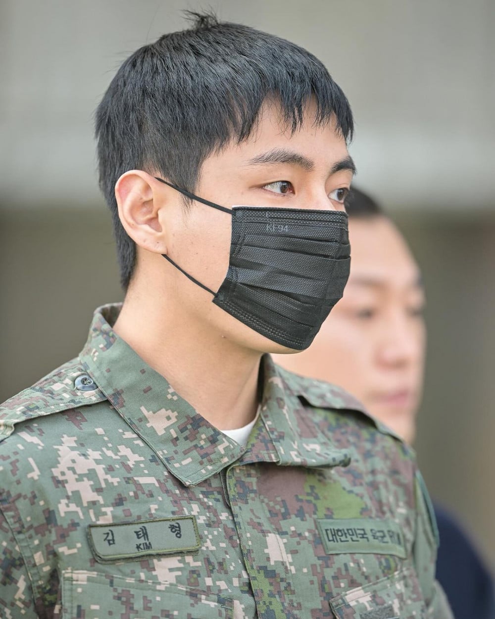 A bulked-up Taehyung looked exceptionally handsome with short hair and dressed in his military uniform. His natural good looks shone through, proving he doesn't need idol styling to be gorgeous.