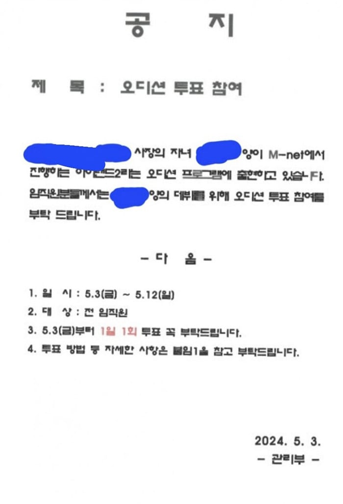 The oldest daughter, Ms. ***, of our respected President *** is currently participating on the Mnet and WAKEONE idol audition program, 'I-Land 2'. All employees, please cast your vote for Ms. *** for her continued participation on this program."