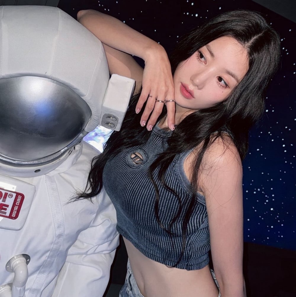 In the released photos, Kwon Eun Bi flaunted her futuristic fashion sense, wearing a sleeveless crop top with a highlight on the chest area and shiny jeans. Posing next to an astronaut in what appears to be a space-themed background, her dazzling beauty and relaxed expression caught the eye.