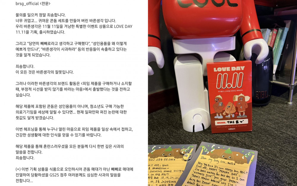 Barun Saenggak wrote, "We sincerely apologize for causing any concern. We’re Bareun Saenggak, the brand that made an irresistibly cute… and, yes, adorable condom set. We recently released a special event product, “LOVE DAY 11.11,” designed for November 11."