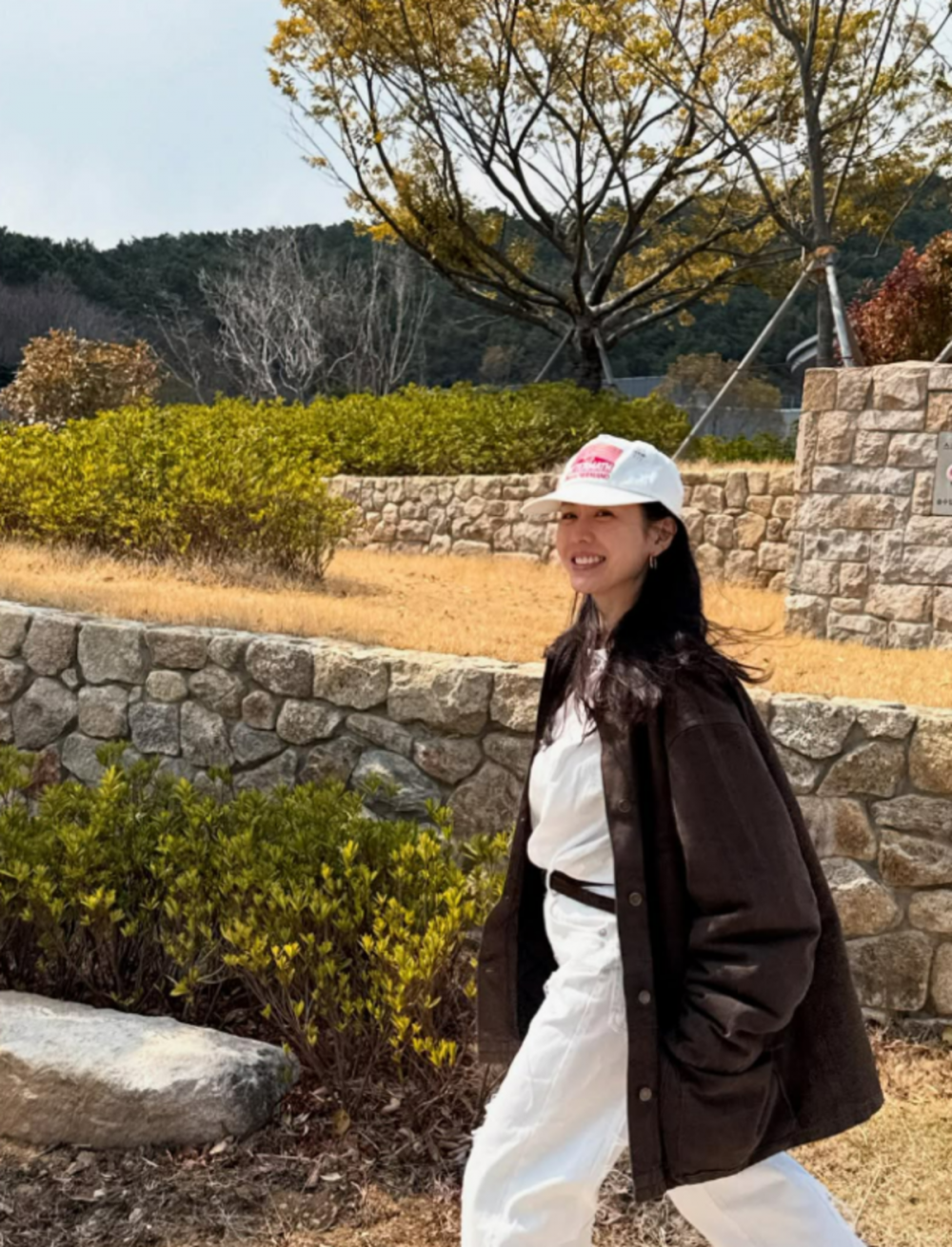 In the photos, Son Ye Jin is seen wearing a white cap and a brown jumper, beaming brightly at the camera. In some shots, she is walking toward an unknown destination, while in others, she is sitting on a bench, basking in the sunlight with a gentle smile on her face.
