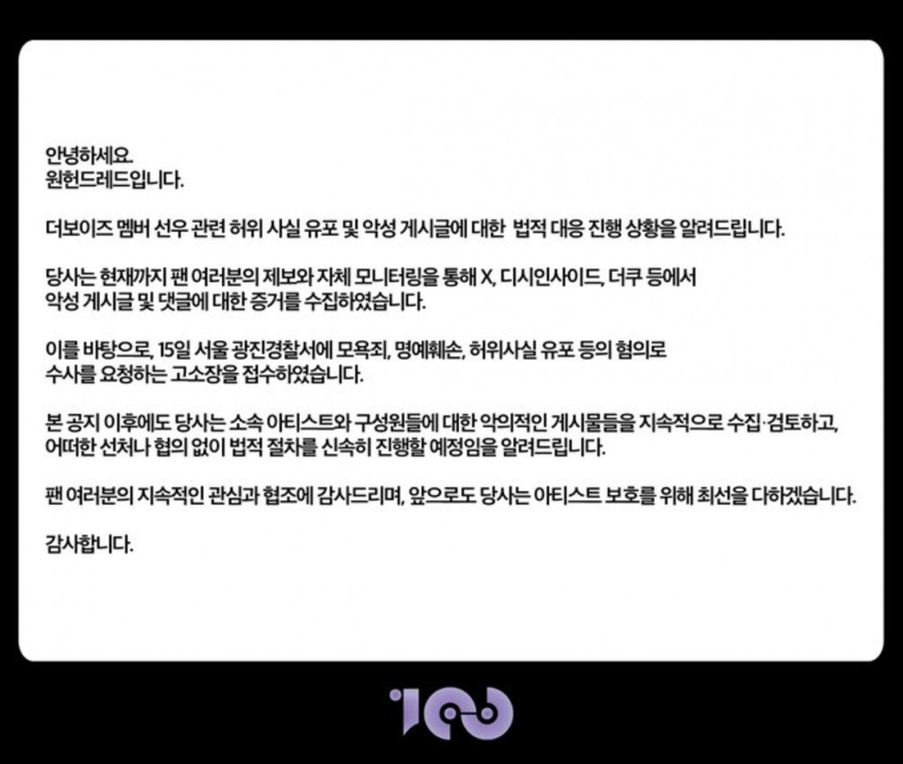 April 15, One Hundred Label has released an official statement addressing the current status of legal action being taken in response to false rumors and malicious online posts targeting The Boyz member Sunwoo.
