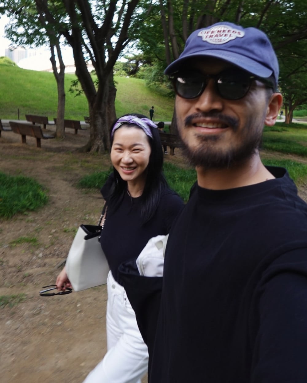 Jang Yoon Ju and her husband are pictured in a casual park date, looking chic and casual in matching outfits.
