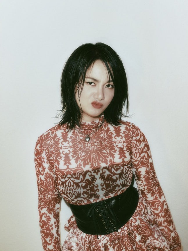 With a tousled bob that appears slightly wet, natural makeup, and a voluminous, red, baroque-patterned chiffon dress, Park Na Rae presents a sexy yet contemporary look. She adds a sense of liveliness with poses reminiscent of scenes from a movie. Through her pink styling, she exudes a bold yet lovely moment. Her playful facial expressions radiate a free-spirited charm.