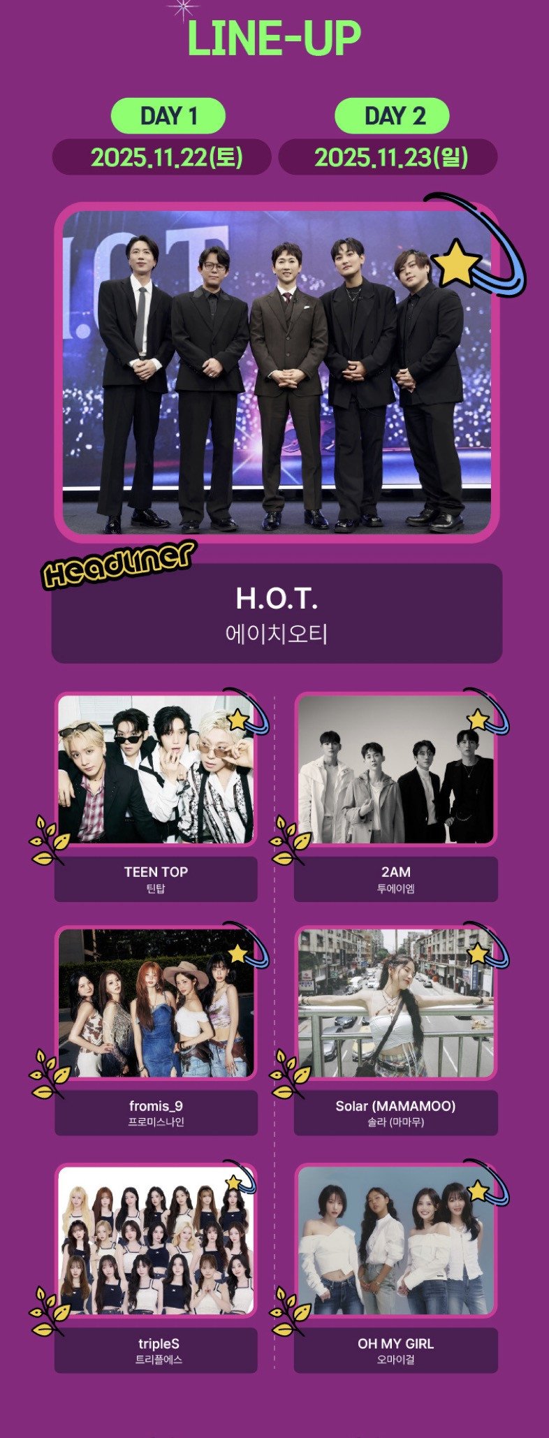 According to the '2025 Hanteo Music Festival' on October 10 KST, the event will now take place from November 22-23 at the Inspire Arena in Incheon. 1st generation idol group H.O.T will headline both days, joined by TEEN TOP, fromis_9, and tripleS on day 1 and by 2AM, Solar of MAMAMOO, and Oh My Girl on day 2. The festival also previously emphasized that as headliners, H.O.T will perform a longer set of approximately 1-hour.